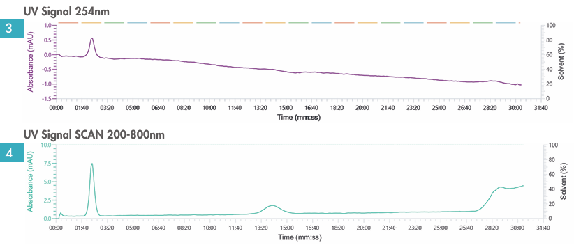 图3与图4:紫外检测下化合物不可见。。。。。。。检测初期首波化合物最先展现低强度信号,,,,,,,但强度缺乏以实现有用网络