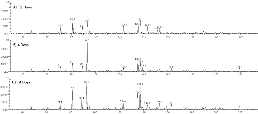 ¡¤ÒÒ´¼¶þ¾ÛÌ壨m/z 93£©Å¨¶ÈÔÚ4ÌìʱµÖ´ï·åÖµ£¬£¬£¬£¬ £¬£¬£¬£¬Åú×¢·¢½ÍÒªº¦ÆÚÔÚǰ¼¸Ì죻£»£»£»£»£»